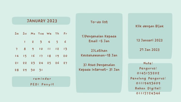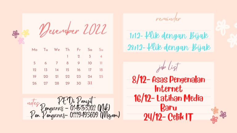 [ MAKLUMAN ] ?????? ???????? PEDi Panyit.. Berikut merupakan jadual perancangan aktiviti yang akan dijalankan oleh PEDi Panyit bagi bulan Februari 2023. Sebarang perubahan aktiviti adalah bergantung kepada situasi semasa. Sebarang permintaan untuk kelas adalah dialu-alukan Daftar sekarang jika anda […]