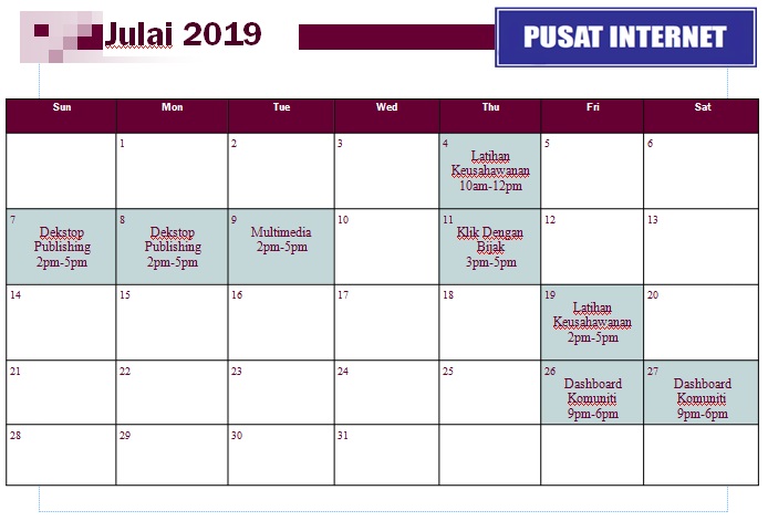 TARIKH AKTIVITI 7 Disember 2018 Klik Dengan Bijak (Online Grooming) 8 Disember 2018 Klik Dengan Bijak ( Maklumat Palsu) 14 Disember 2018 Jom Sihat Bersama Pusat Internet 18 Disember 2018 Microsoft Word 19 Disember 2018 Microsoft Word