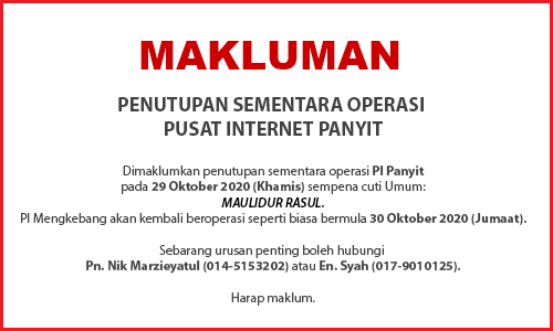 MAKLUMAN. PUSAT INTERNET PANYIT akan mula beroperasi pada 18 MEI 2020 (ISNIN). Dalam fasa norma baharu para pengguna Pusat Internet perlu mematuhi SOP yang ditetapkan dalam membendung penularan wabak virus covid-19.