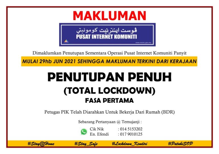 Berikutan perlaksanaan Total Lockdown, operasi PIK diseluruh negara akan ditutup sepanjang Fasa 2, 29 Jun hingga makluman terkini dari kerajaan. Peranan PIK pada masa kini adalah amat bermakna dan penting khususnya bagi pembelajaran atas talian, namun begitu dengan penularan kes Covid […]