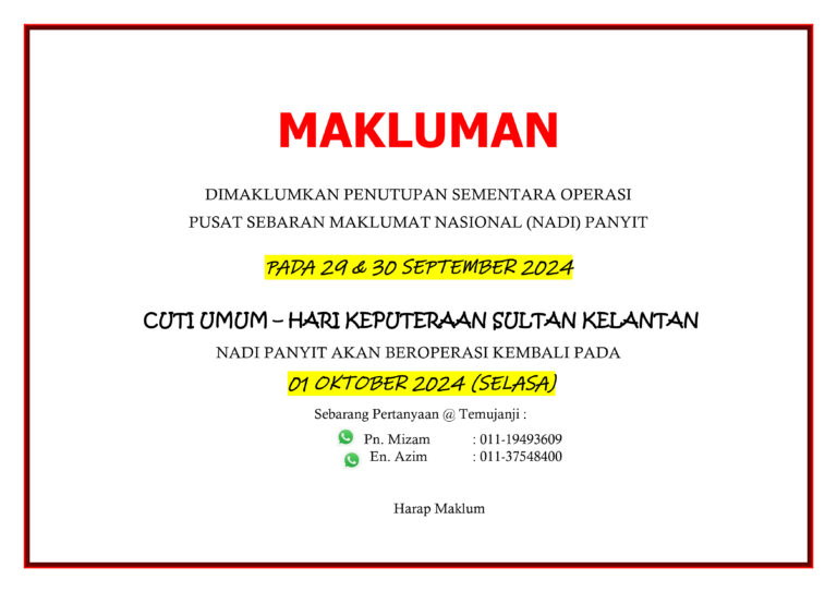 Penutupan sementara operasi NADI Panyit pada: Tarikh: 29 & 30 September 2024 Hari: Ahad dan Isnin CUTI UMUM ( Hari Keputeraan Sultan Kelantan ) NADI akan beroperasi kembali pada: Tarikh: 01 Oktober 2024 Hari: Selasa Harap Maklum. Terima Kasih. Sebarang […]