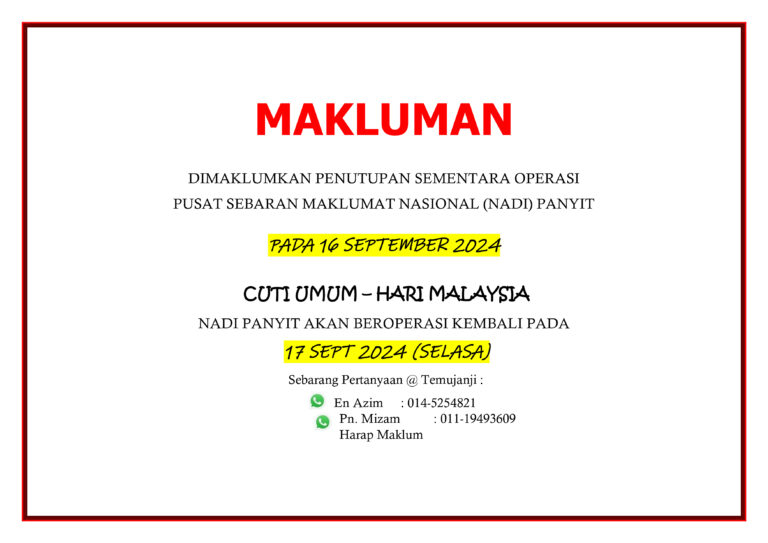 Penutupan sementara operasi NADI Panyit pada: Tarikh: 16 September 2024 Hari: Isnin CUTI UMUM ( Hari Malaysia ) NADI akan beroperasi kembali pada: Tarikh: 17 September 2024 Hari: Selasa Harap Maklum. Terima Kasih. Sebarang urusan, boleh hubungi: Puan Mizam (011-19493609) […]