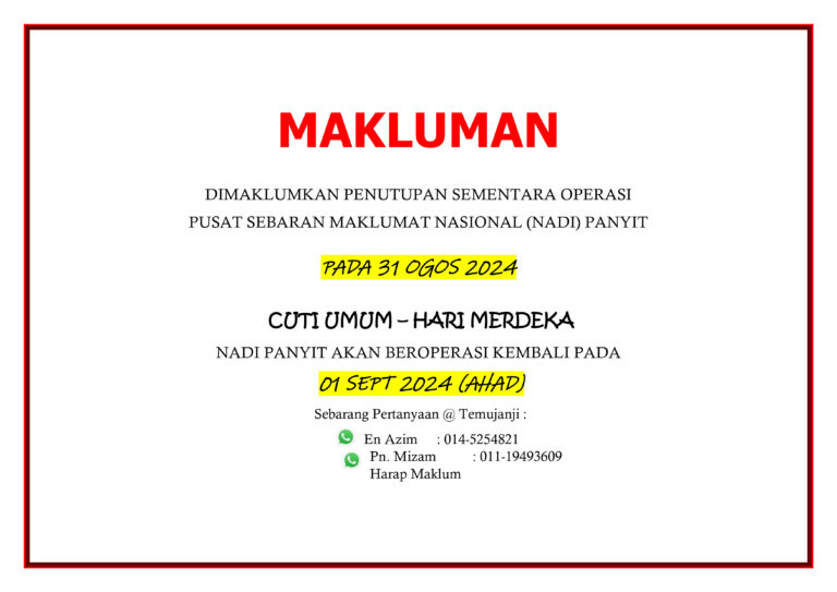 Penutupan sementara operasi NADI Panyit pada: Tarikh: 16-18 Jun 2024 Hari: Ahad-Selasa CUTI UMUM ( Hari Arafah & Hari Raya Aidiladha ) NADI akan beroperasi kembali pada: Tarikh: 19 Jun 2024 Hari: Rabu Harap Maklum. Terima Kasih. Sebarang urusan, boleh […]