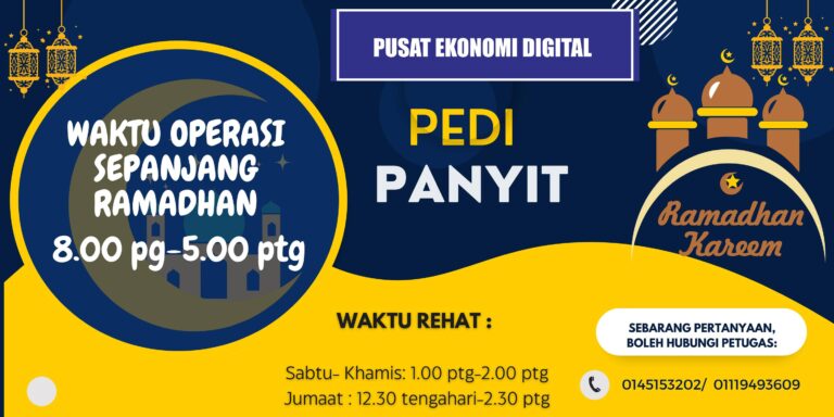 Assalamualaikum dan salam sejahtera Untuk makluman, Pusat Ekonomi Digital (PEDi) Panyit tidak beroperasi pada tarikh 21-23 April 2023 sempena Hari Raya Aidilfitri. Kami juga ingin mengucapkan Selamat Hari Raya Aidilfitri, Maaf Zahir & Batin.
