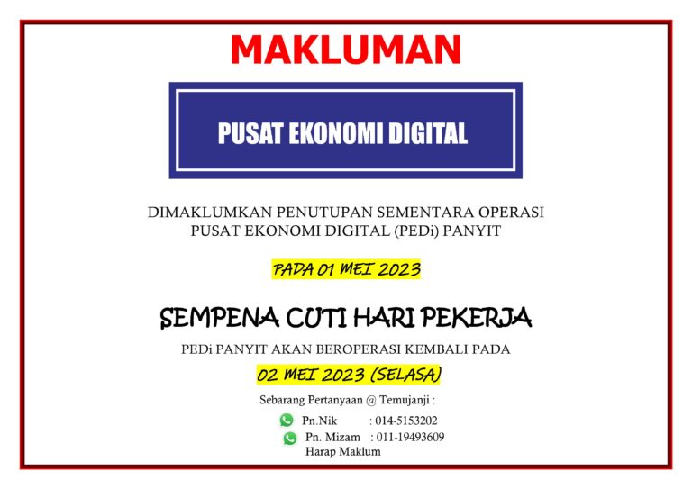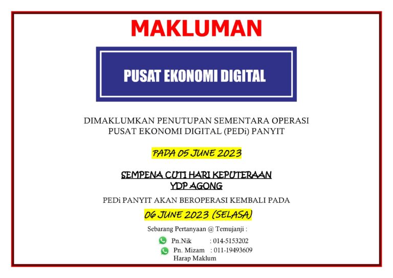 Assalamualaikum dan salam sejahtera Untuk makluman, Pusat Ekonomi Digital (PEDi) Panyit tidak beroperasi pada tarikh 21-23 April 2023 sempena Hari Raya Aidilfitri. Kami juga ingin mengucapkan Selamat Hari Raya Aidilfitri, Maaf Zahir & Batin.