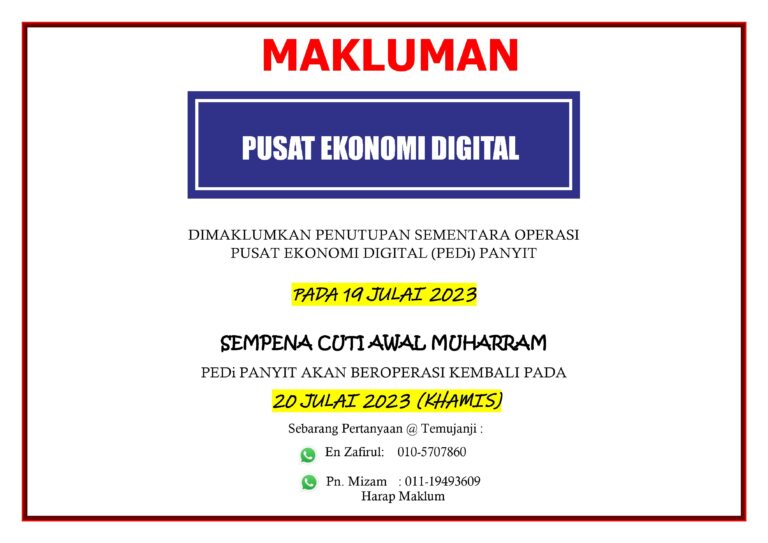 ???????? !Penutupan sementara operasi PEDi Panyit pada:Tarikh : 19 Julai 2023Hari : RabuSEMPENA CUTI UMUM (AWAL MUHARRAM)PEDi akan beroperasi kembali pada:Tarikh : 20 Julai 2023Hari : KhamisHarap Maklum. Terima Kasih.Sebarang urusan, boleh hubungi Encik Zafirul (010-5707860) Puan Mizam (011-19493609) #pedipanyit#PusatEkonomiDigitalMalaysia […]