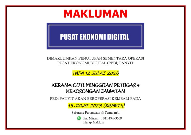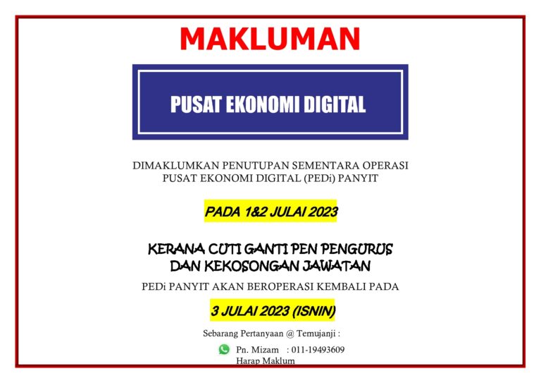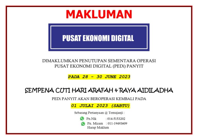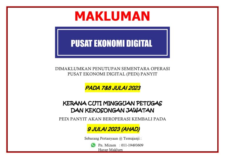 ???????? !Penutupan sementara operasi PEDi Panyit pada:Tarikh : 19 Julai 2023Hari : RabuSEMPENA CUTI UMUM (AWAL MUHARRAM)PEDi akan beroperasi kembali pada:Tarikh : 20 Julai 2023Hari : KhamisHarap Maklum. Terima Kasih.Sebarang urusan, boleh hubungi Encik Zafirul (010-5707860) Puan Mizam (011-19493609) #pedipanyit#PusatEkonomiDigitalMalaysia […]
