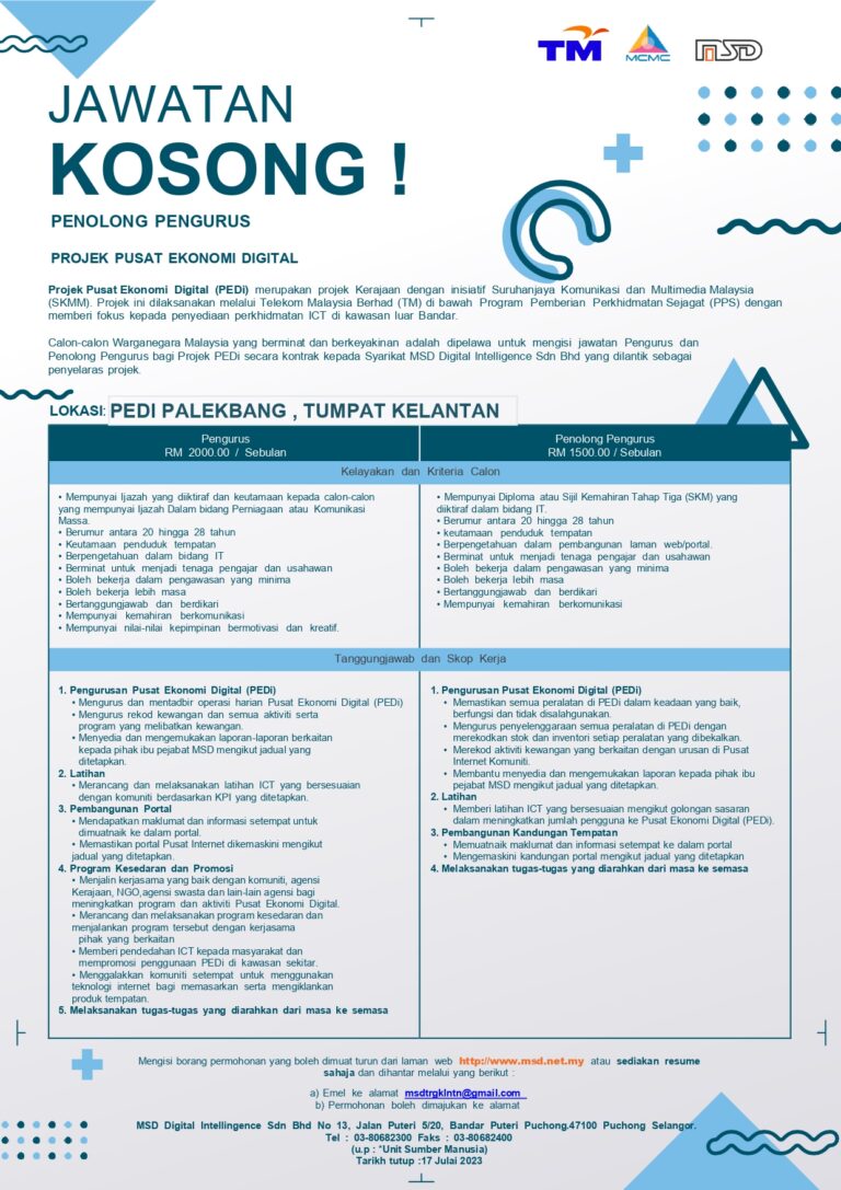 Iklan Kekosongan Jawatan kepada yang berkelayakan untuk Jawatan Kosong Pusat Ekonomi Digital (PEDi) Palekbang, Tumpat, Kelantan – Jawatan : Penolong Pengurus PEDi – Kelayakan: Diploma @ Sijil Kemahiran Tahap Tiga dalam bidang berkaitan IT – Lokasi : Pusat Ekonomi Digital […]