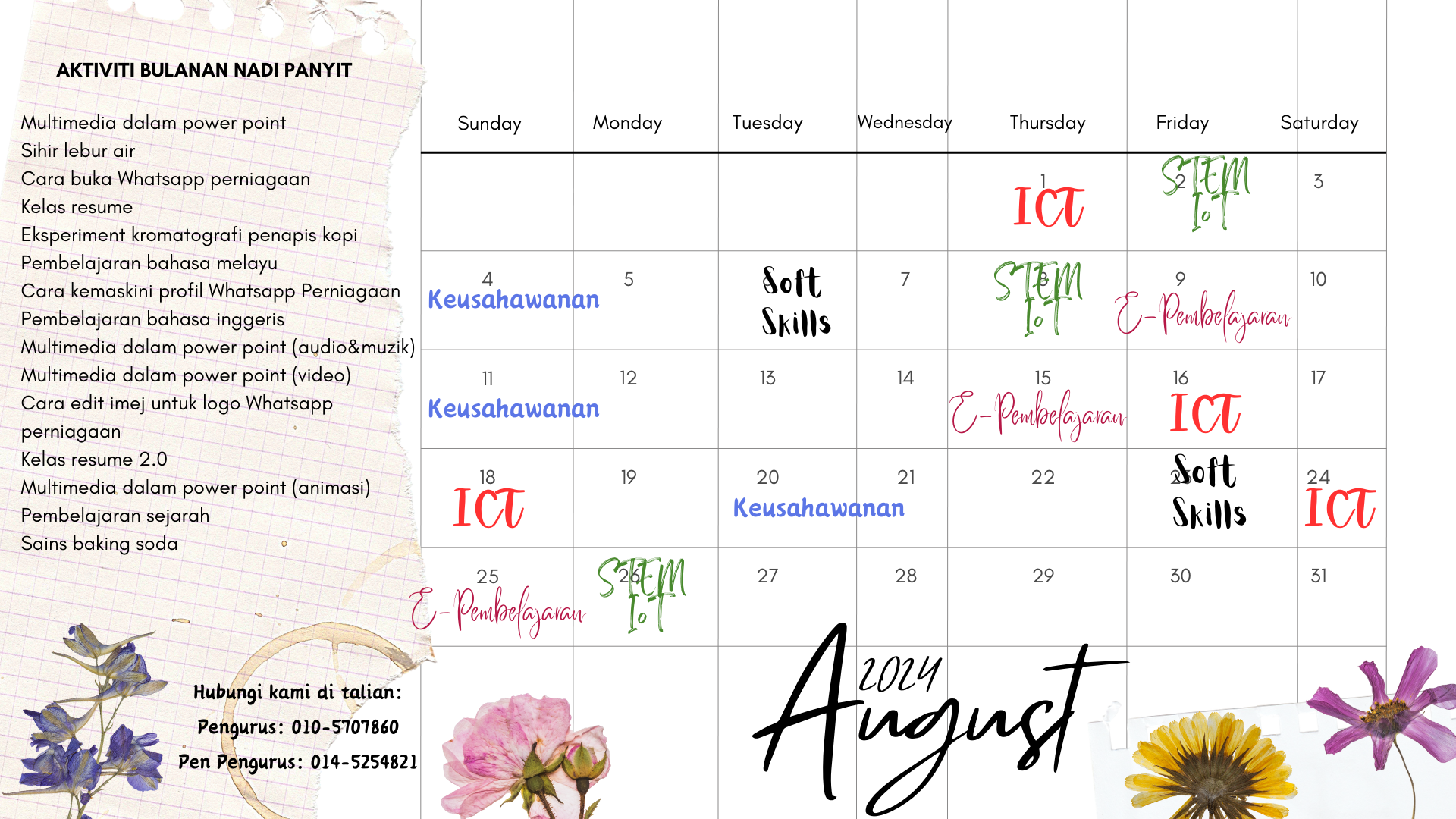 Berikut merupakan jadual perancangan aktiviti yang akan dijalankan oleh NADI Panyit bagi bulan Ogos 2024.
