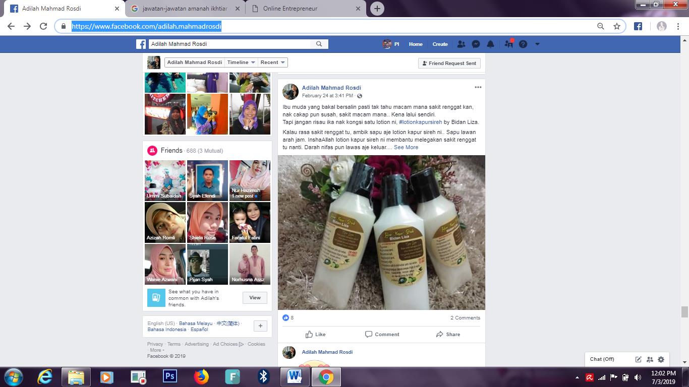Beliau berniaga sambilan secara jualan langsung di pejabat dan kawasan kejiranannya sahaja. Puan Adilah sering turut serta aktiviti-aktiviti usahawan yang dijalankan di Pusat Internet berdekatan, terutama di PI Panyit. Dengan inisiatif sendiri, Beliau mula mempromosikan produknya melalui aplikasi whatapps dan seterusnya aplikasi facebook. Bukan sahaja mengisi waktu lapangnya, perniagaan sambilan ini juga dapat meningkatkan pendapatannya sebanyak RM 1000 hingga RM 3000 sebulan.