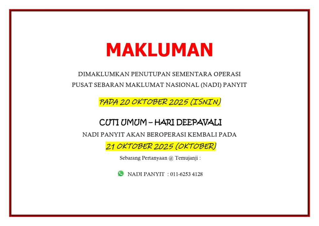 NOTIS PENUTUPAN NADI PANYIT SEMPENA CUTI UMUM – HARI DEEPAVALI