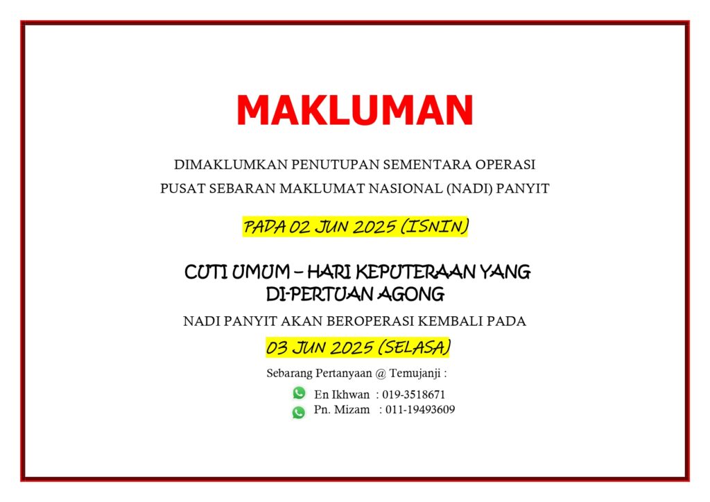 NOTIS PENUTUPAN NADI PANYIT SEMPENA CUTI UMUM – HARI KEPUTERAAN YANG DI-PERTUAN AGONG