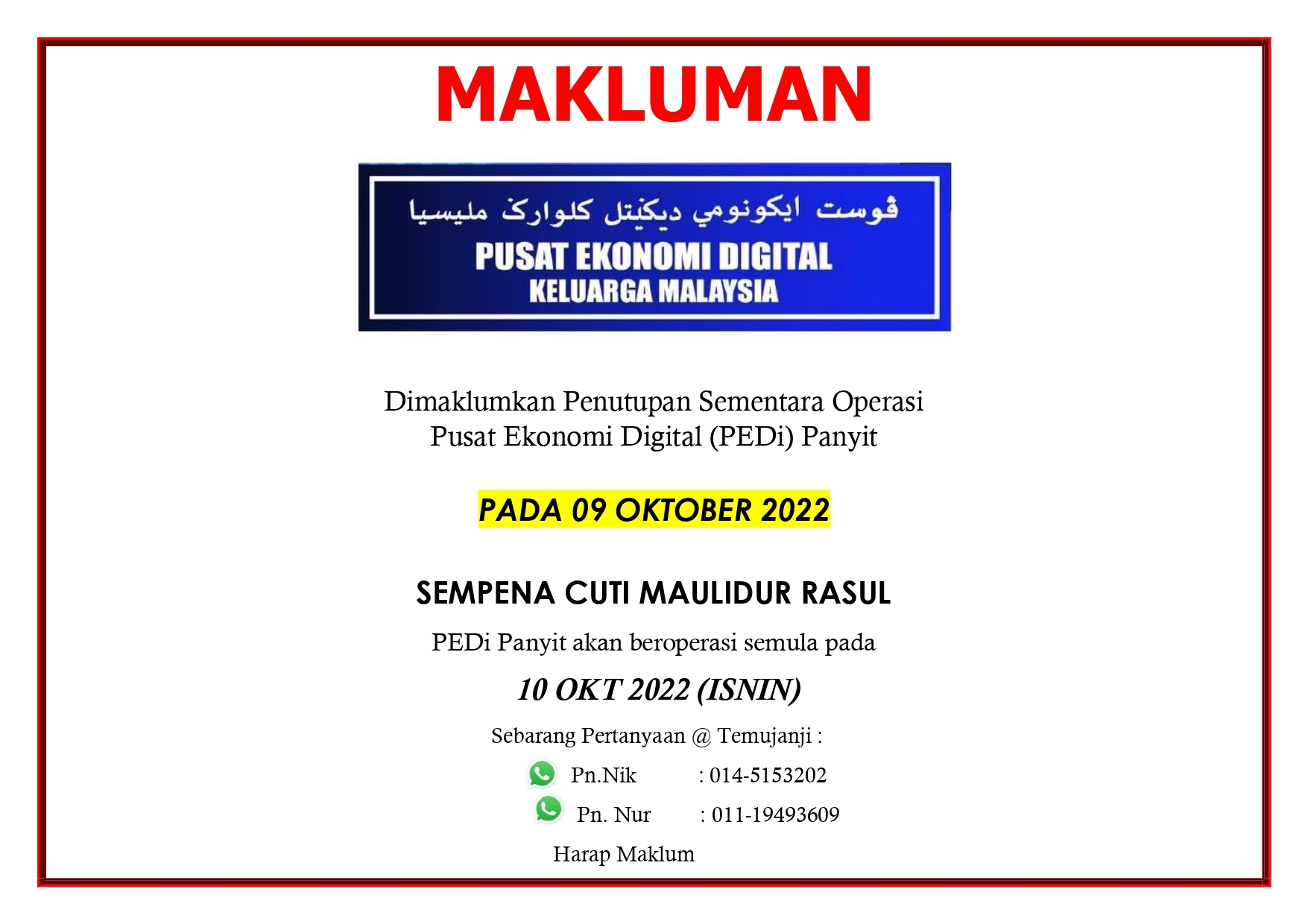 Notis Penutupan Sementara PEDi Panyit Maklumat Am | 13 October 2022 MAKLUMAN Dimaklumkan Penutupan Sementara Operasi Pusat Digital (PEDi) Panyit pada 9 Oktober 2022 (Ahad) kerana Cuti Maulidur Rasul. PEDi Panyit akan kembali beroperasi pada 10 Oktober 2022