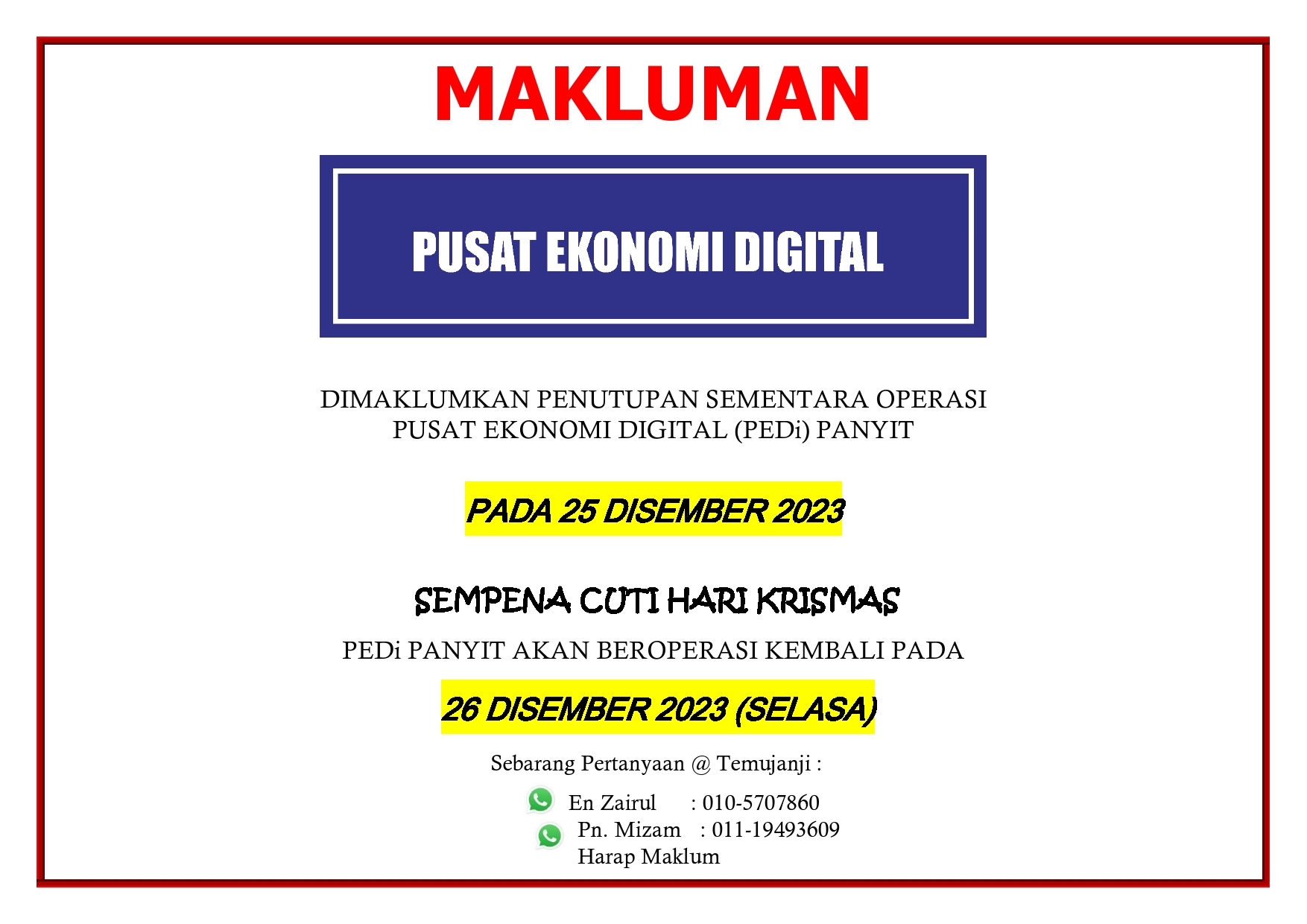 Sebarang urusan, boleh hubungi:
